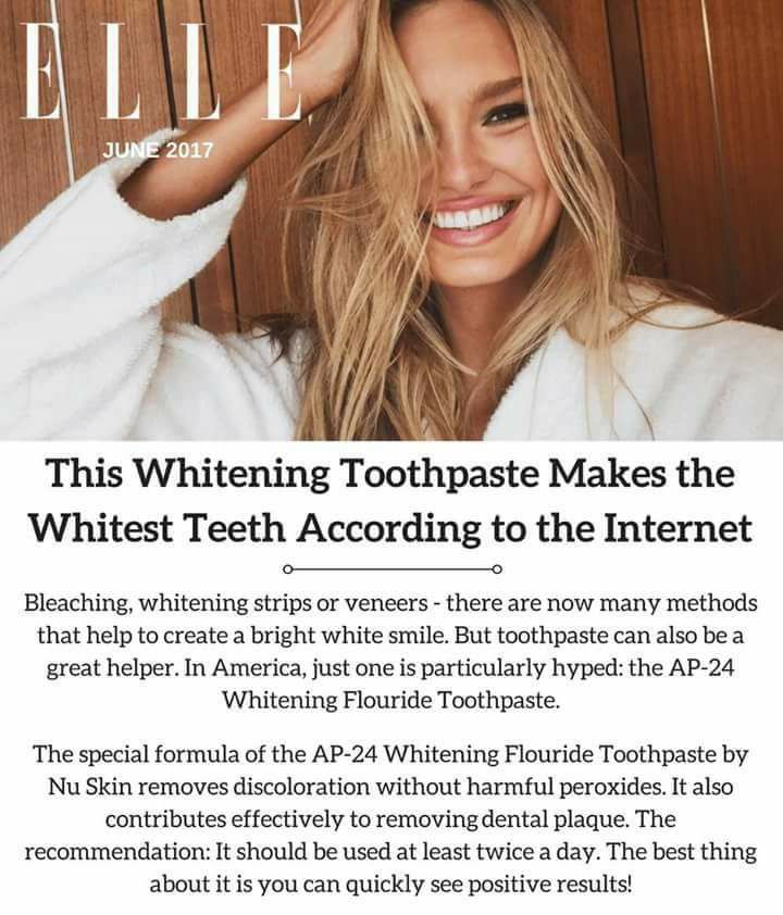 Die spezielle Formel der AP-24 Whitening Fluoriere Zahnpasta von Nu Skin entfernt ohne schädliche Peroxide und Verfärbungen auf dem Zahnschmelz. Nebenbei trägt sie effektiv zur Karies-Prophylaxe bei. Die Empfehlung: Sie sollte mindestens zweimal täglich benutzt werde. Und das Beste: Man sieht schnell positive Resultate und sie ist sogar in Deutschland erhältlich.